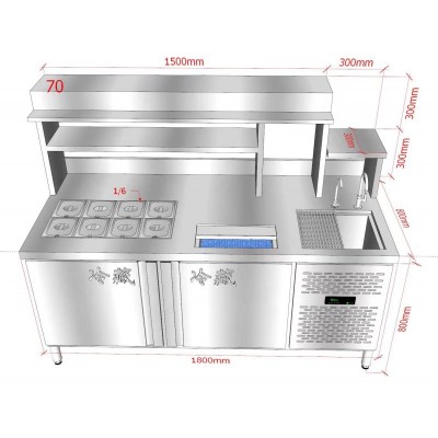 专业不锈钢水吧台定制,可根据客户意愿出具相关产品样图,配置蓝光杀菌功能,储冰槽,冷藏小料盒,沥水板,洗杯器,直饮水等等